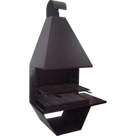 Composizione di barbecue mod.2007 di 80 cm con supporto a sospensione trapezoidale per muro e anta, tutti realizzati in ferro e vernice anticalorica di 600º, include braciere, griglia con asta di Ø 6 mm e manici removibili.